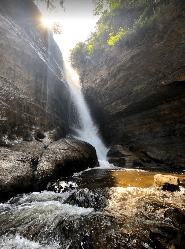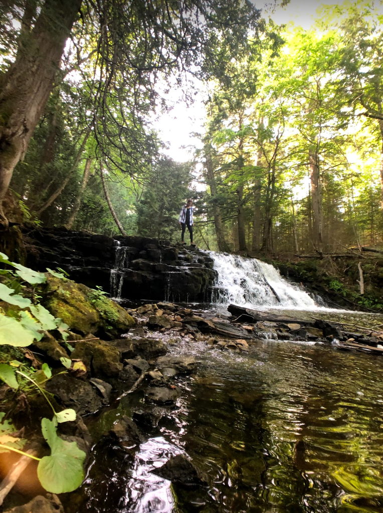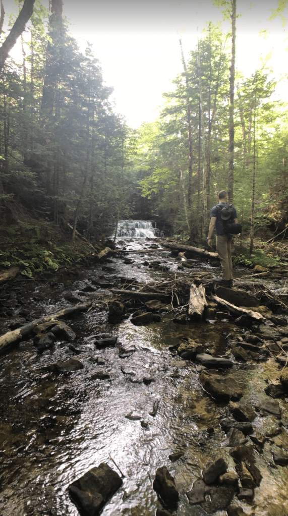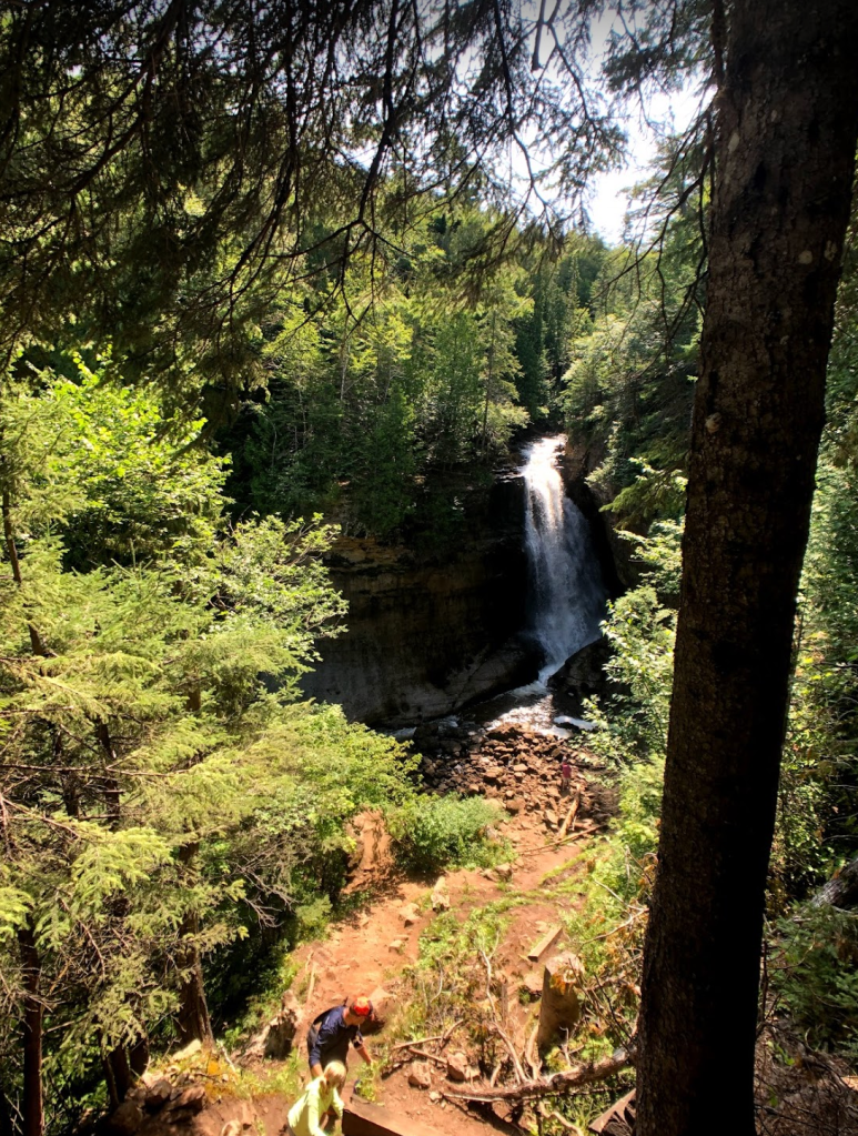 The next day we went to Miner’s Falls, which is a shorter day hike within Pictured Rocks. It was about a 25 min drive from Munising and an easy 1.2 mile hike round trip to the falls. There are some stairs that go down to a little outlook to view the falls. You can either enjoy the view from the outlook or take a steep rocky off trail path down to the rocks at the bottom of the falls. Ian and I quickly hiked down to the bottom of the falls, while my family stayed on the outlook. It would be best to have proper hiking shoes on to get to the bottom, otherwise it could be slippery. Overall, this is a very easy nice hike & site to see.