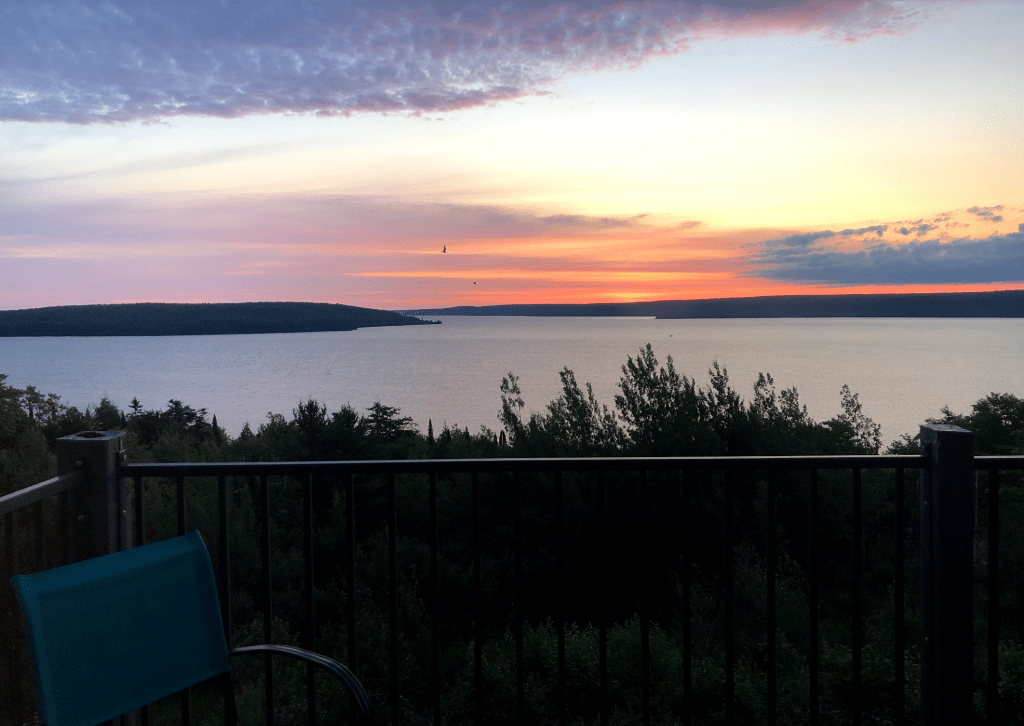 Then we drove to Munising, about 1.5 hours away, and checked into the Holiday Inn hotel. We had a really great view of Lake Superior and Pictured Rocks in the distance from our hotel balcony. We arrived a little later to Munising than we expected, so we skipped the first two little waterfall hikes we had planned (Munising Falls and Wagner Falls) and went to dinner at Tracey’s at Roams Inn in Au Train. After dinner, we went straight to Au Train Beach, which was pretty close to the restaurant. Au Train Beach is right off the road. There’s a parking lot right there and just a short walk to the beach. We bought a bundle of firewood from a gas station nearby and made a quick little bonfire on the beach (also brought some lighter fluid, camping chairs, wine, and s’more stuff.) We made some s’mores over the fire for dessert & wine while enjoying the beautiful sunset over Lake Superior. 🙂