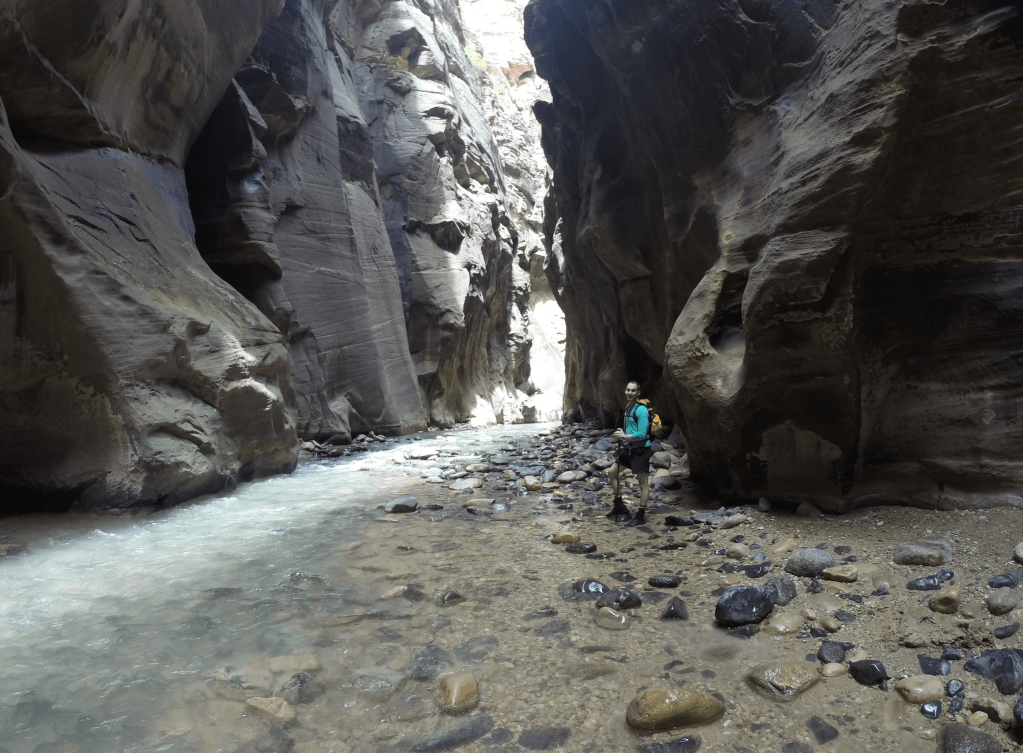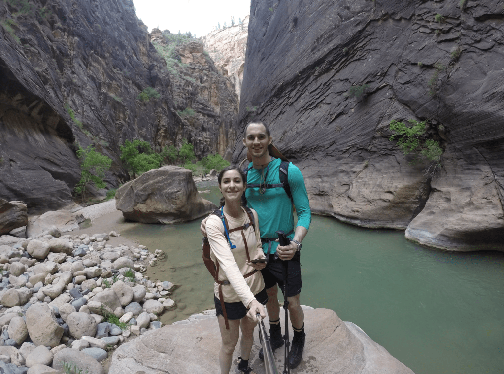We had to prepare for this hike before hand with some proper gear. It’s definitely good to have quick-dry hiking clothes and a camelback water bladder. We bought neoprene socks to wear with our hiking boots because the water is freezing. We also bought walking sticks, which is a must. It’s difficult to walk because the entire hike is covered in slippery rocks and you’re constantly maneuvering around them. Ian and I wore our own hiking shoes, but you can rent canyoneering boots, neoprene socks, walking sticks and other gear from Zion Outfitters downtown.