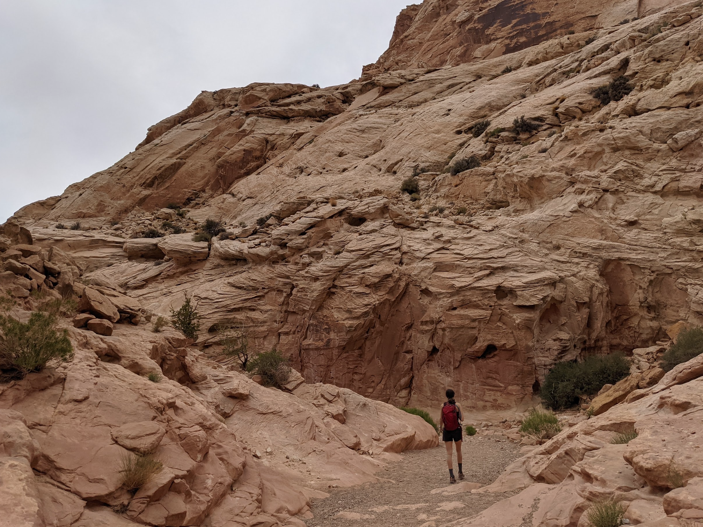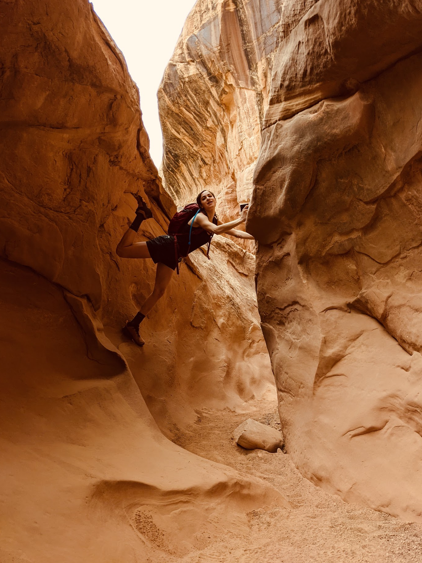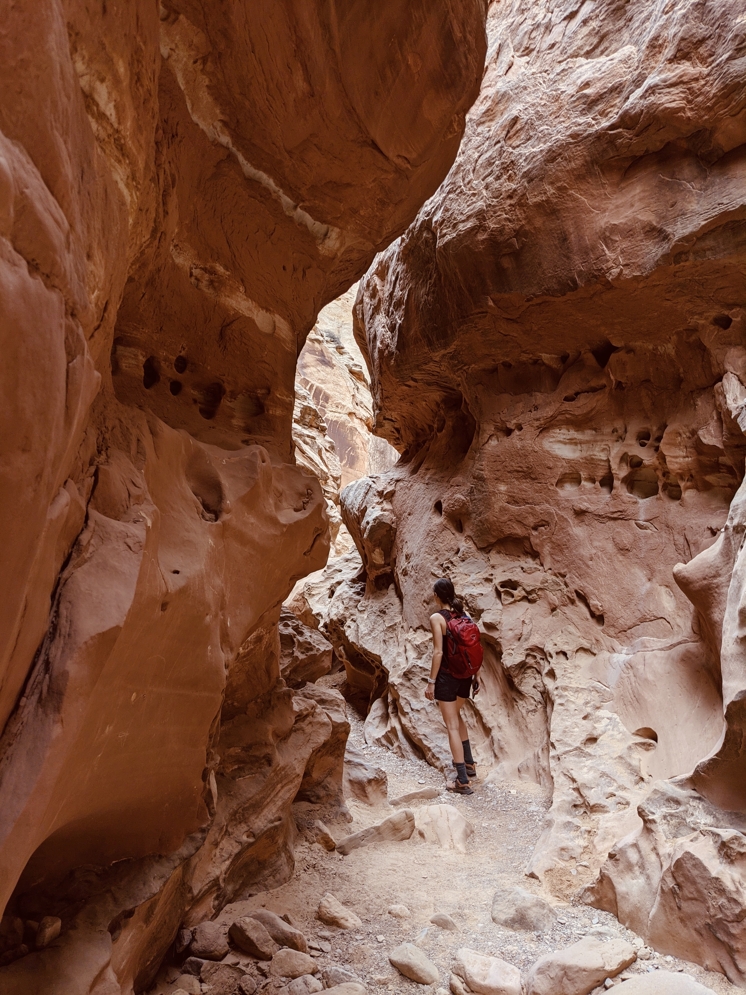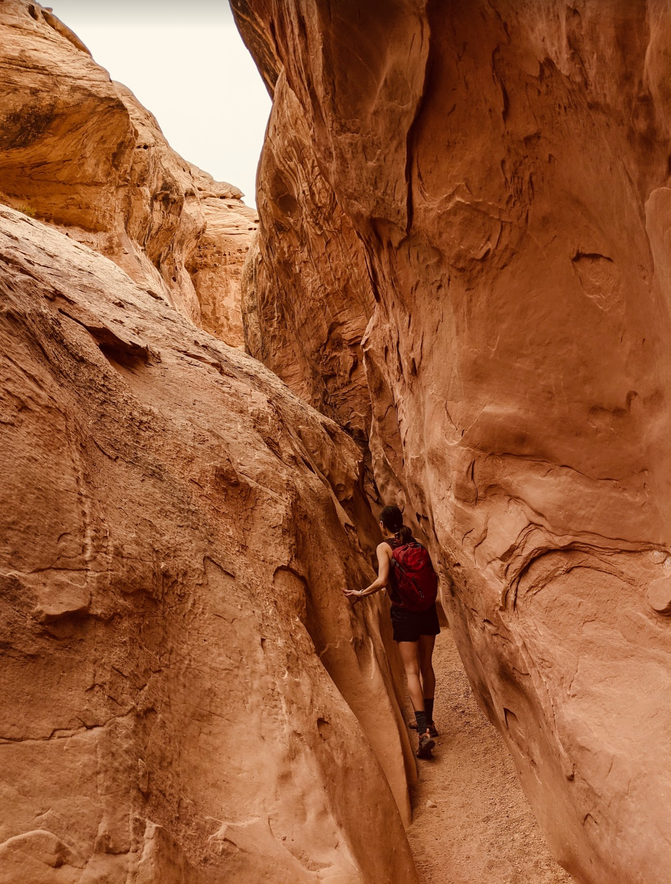After breakfast, it was time to start driving to our next location and start making our way South West. Our next stop was Little Wild Horse Canyon. This hike was super cool! Probably one of our favs, although hard to tell because all the hikes were so amazing and different in their own way. Little Wild Horse was cool because as you walk through, the canyons start getting more and more narrow throughout. In some parts you had to walk sideways to fit through, which is a little scary, especially being claustrophobic. It reminded me a lot of the Antelope Canyons in Page, Arizona. This hike was nice because it was pretty empty and we felt like we were completely on our own most of the time. Ian and I had so much fun walking through, climbing over and under rocks, and attempting to scale the wall. We ended up doing 4 miles out and back. Luckily, this hike was fairly easy and flat, other than climbing over some rocks here and there. Since it’s a slot canyon, we were told to be cautious about any rain on the radar because if there is a flash flood it can be extremely dangerous in such narrow canyons.