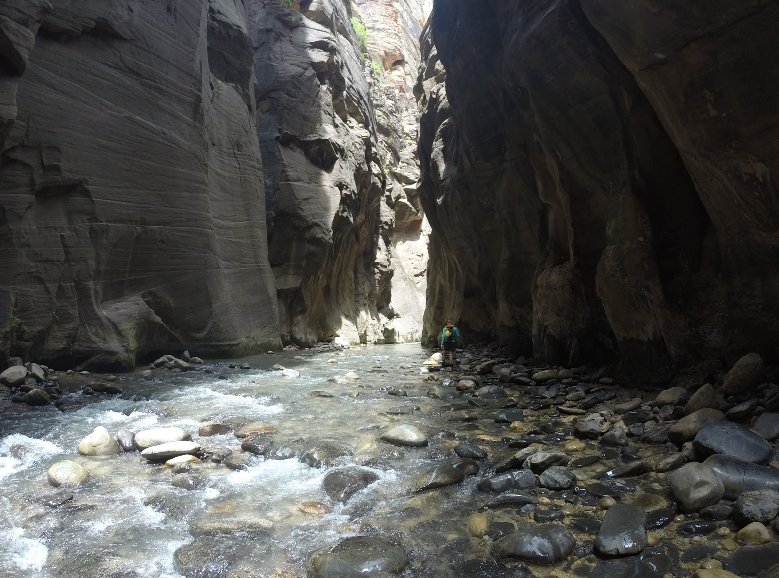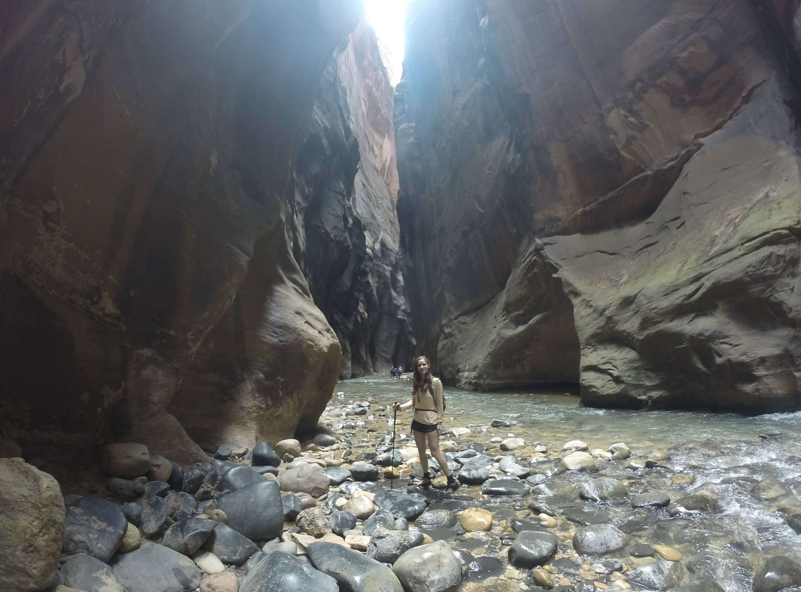 We had to prepare for this hike before hand with some proper gear. It’s definitely good to have quick-dry hiking clothes and a camelback water bladder. We bought neoprene socks to wear with our hiking boots because the water is freezing. We also bought walking sticks, which is a must. It’s difficult to walk because the entire hike is covered in slippery rocks and you’re constantly maneuvering around them. Ian and I wore our own hiking shoes, but you can rent canyoneering boots, neoprene socks, walking sticks and other gear from Zion Outfitters downtown.